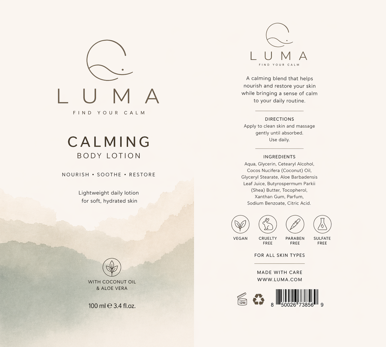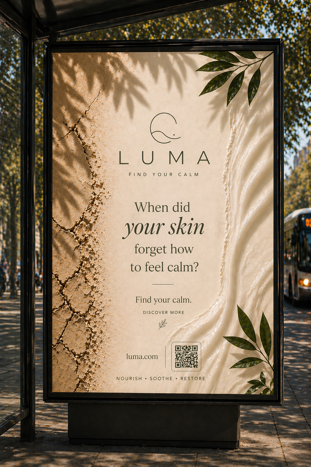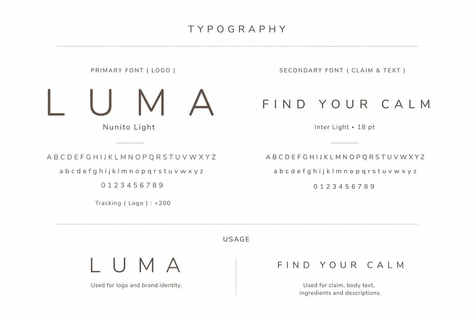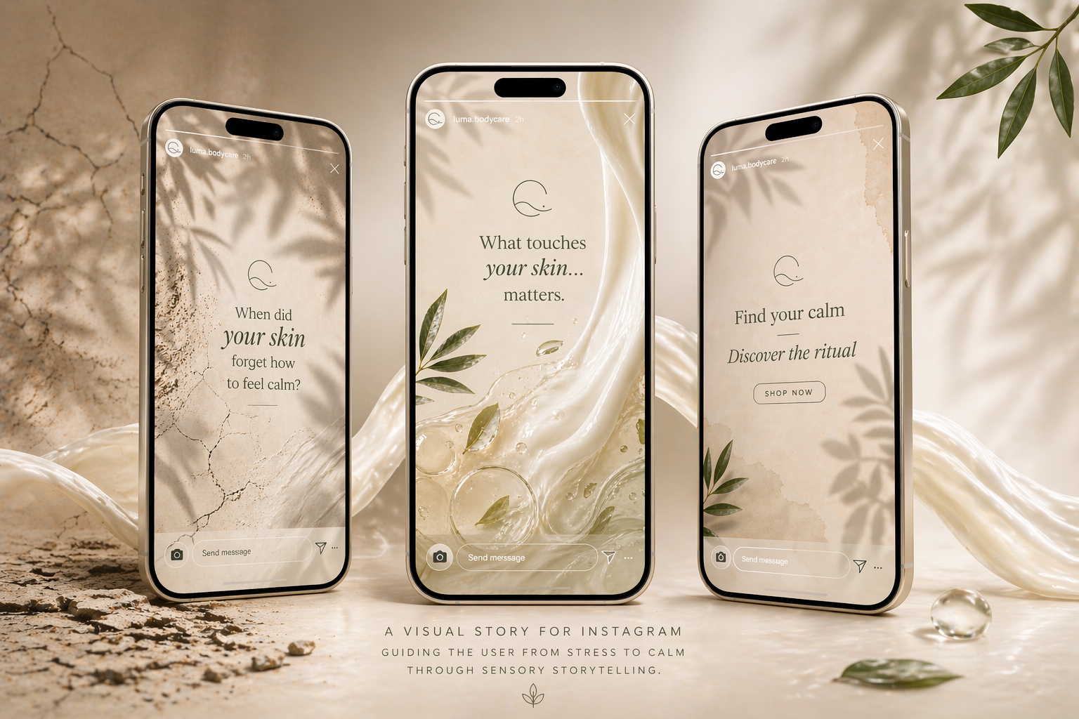 LUMA is a conceptual skincare brand designed to evoke calm, simplicity, and natural care. The visual identity focuses on soft tones, clean typography, and minimal composition to reflect a quiet and balanced aesthetic.
